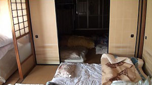雑魚寝宿舎の二階風景。ここにスタッフ俳優六人寝る。布団は借りたり持ち込んだり。今村プロ名物の完全合宿が久々に復活した。