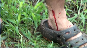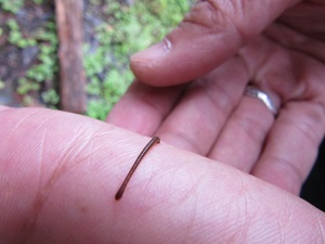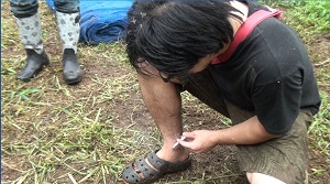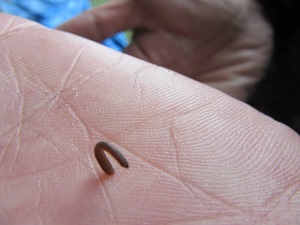 もちろん危険なのは足だけではない。ヒルは木の上で待ち伏せて落下攻撃もするので首筋とか顔や頭も要注意だ。俺は警戒して長靴を履いていたけど長靴だって安全ではない。這い上って上の縁から内部に潜り込むのである。長靴を脱いだら血だらけヒルだらけということもある。