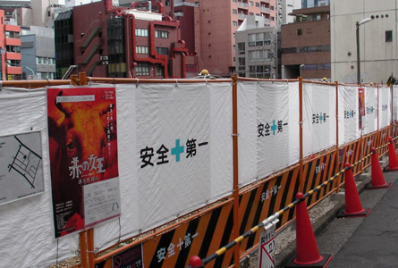店の前の工事現場にも赤い牛登場! ミニポスターも近隣に貼られます。